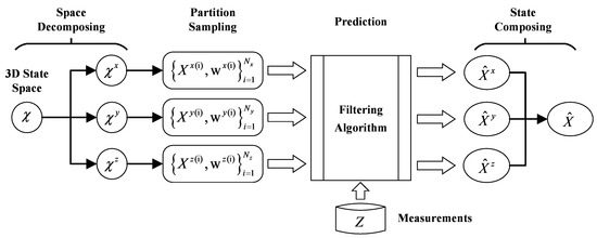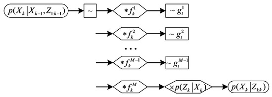 The final output is the weighted sum of all predicted sub-states. It is assumed that the state space can be partitioned as , while is a weighting function used to weight the sub-states in weighted resampling, and the particles are propagated by the proposal function which can be decomposed as follows [41],
