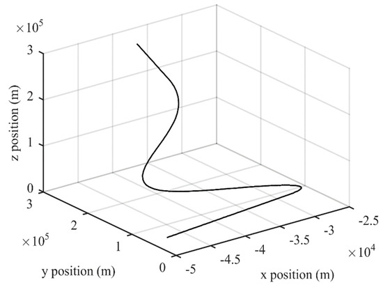 To validate the effectiveness of the algorithm, a high-maneuvering target motion process with variable acceleration in three-dimensional state space is simulated for experiments. The maneuvering parameters are set to the maneuvering frequency f = 1/6, and the maximum acceleration rate of change jmax = 5 m/s3. The initial position of the given target in the Cartesian coordinate system is assumed as [−50,000 m, 20,000 m, 30,000 m], the initial velocity corresponding to each direction is [300 m/s, 150 m/s, 200 m/s], and the initial acceleration and rate of change of acceleration in each direction are 0 m/s2 and 0 m/s3, respectively. In summary, the initial state vector is expressed as X0 = [−50,000 m, 300 m/s, 0 m/s2, 0 m/s3, 20,000 m, 150 m/s, 0 m/s2, 0 m/s3, 30,000 m, 200 m/s, 0 m/s2, 0 m/s3]T. The sampling interval is T = 1 s, and the total number of time steps for the duration of tracking is L = 200. From 0 to 60 s, the target moves with constant velocity. From 60 to 100 s, it moves with constant acceleration [−20 m/s2, 30 m/s2, 15 m/s2]. From 100 to 120 s, it moves with the rate of change of acceleration [3 m/s3, 1 m/s3, 0 m/s3]. From 120 to 140 s, its rate of change of acceleration jumps to [−1 m/s3, −3 m/s3, −2 m/s3]. From 140 to 160 s, its rate of change of acceleration jumps to [−2 m/s3, 0 m/s3, −1 m/s3]. From 160 to 180 s, it holds constant acceleration in this 20 s. Finally, the target keeps moving with constant velocity from 180 s to the end. Figure 5 shows the real target trajectory.