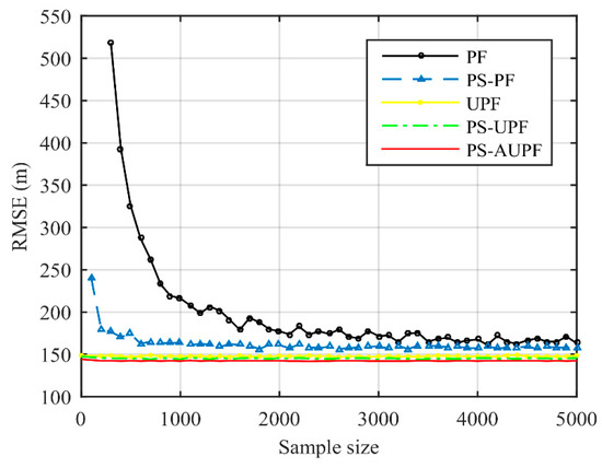 For algorithms based on the PF scheme with fixed sample size, expanding the sample size will improve tracking accuracy. However, once the sample size reaches a certain degree, due to the limitations in algorithms and application scenario, the tracking performance will gradually stabilize, i.e., the expansion of sample size will not lead to significant improvement in accuracy as before, and the tracking error will approach the minimum error threshold. In this section, assuming that both the process noises and measurement noises obey the Gaussian distribution with the mean of 0, the standard deviation of measurement noises is set to 100 m for experiments to find the required sample size of PF, PS-PF, UPF and PS-UPF with the optimal accuracy. Furthermore, the simulation of PS-AUPF is also carried out in this section. By changing the initial sample size, the adaptive strategy in Section 3 is further validated.