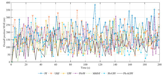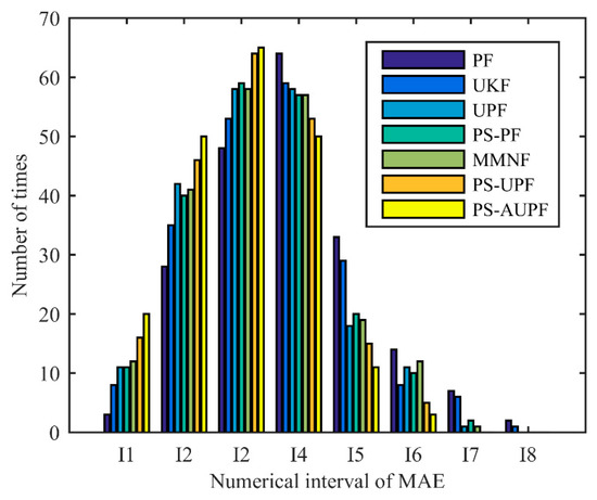 Among these algorithms, PF has the largest randomness of errors, while the error distribution of UPF is approximately close to that of MMNF, which shows the effectiveness of using UKF to establish the proposal distribution of PF. PS-PF, both in the error randomness and in the occurrences of error spikes, is lower than PF and UKF, and is close to UPF and MMNF. Relatively speaking, the MAE distributions of PS-UPF and PS-AUPF are more concentrated than that of others, with lower fluctuation range, randomness of error and occurrences of large error spikes, and the tracking accuracy of these two are also close. For further verification, Figure 8 shows the average distribution of tracking MAE in each numerical interval during 100 Monte Carlo runs. From PF to PS-AUPF, the MAE distribution appears to be concentrated to the left, and its randomness tends to decrease. For PS-UPF and PS-AUPF, the medians of MAE are reduced by about one interval compared with general PF, and the overall MAE distributions are more concentrated than UPF and MMNF. Especially for PS-AUPF, its 80% MAEs are less than 200, reflecting the improvement of accuracy.