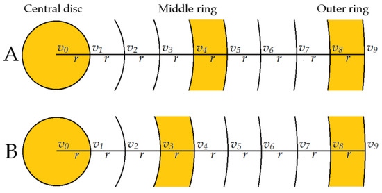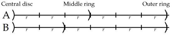 Figure 5. Relative locations of rings with respect to the central disc for CIRD (A) and LIIRD (B) NDM based TCRE configurations.