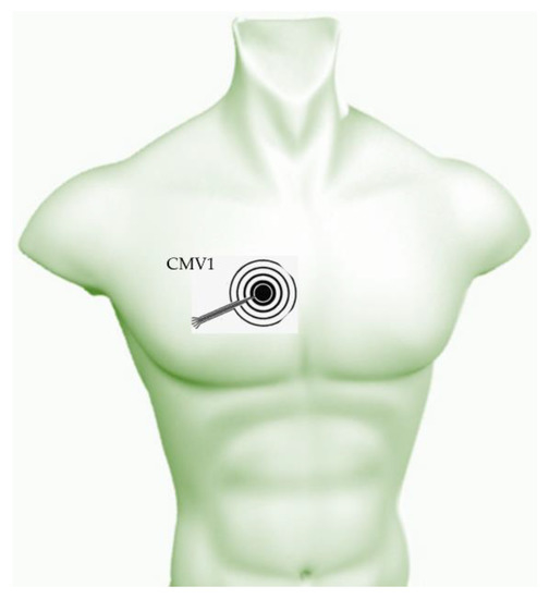 Recordings were conducted with volunteers at rest, lying on a stretcher in a supine position. The sensor node was placed at CMV1 (location comparable to conventional precordial V1, 4th intercostal space to the right of the sternum) for each patient as shown in Figure 3. This location was chosen to make picking up electrical signals from both atria and ventricle easier since the atrial activity is noticeably weaker than that of the ventricle. Previously, to reduce contact impedance, the skin area was slightly exfoliated (Nuprep, Weaver and Company, Aurora, CO, USA) and, in the case of male volunteers, shaved. Five minutes of bipolar ECG signals were recorded for each volunteer.