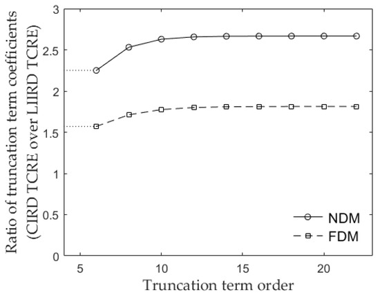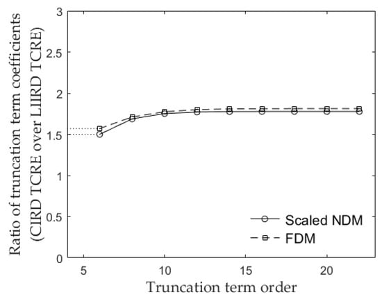 As seen in Figure 4, while the general shapes of the curves corresponding to the truncation term coefficient ratios based on the NDM and the FDM are consistent, there is a substantial difference in scale. This difference arises because the ratios for the NDM were based on TCRE setups presented in Figure 5 [23].