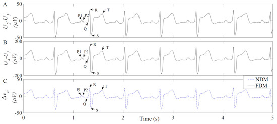 Figure 7. ECG signals: recorded bipolar signals U2U1 and U4U1 (panels (A) and (B) respectively) and Laplacian estimates based on NDM and FDM (panel (C)).