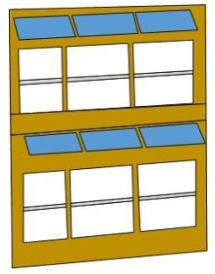 Multiplying Equations (41) and (42) by the collector area results in the collectors’ yearly incident energies in . Table 1 shows the results of yearly incident energies, in , on the top and bottom PV overhang collectors for three distances , , (see Figure 11 and Equations (35)–(38), (40)–(42)) for Tel Aviv (latitude ). are the beam, diffuse and global energy on the top collector, respectively and are the beam, diffuse and global energy on the bottom collector, respectively. The percent difference in global energy between the top and bottom collectors are 48.87, 32.95, 24.48%, for , respectively. This difference stems from shading on the bottom collector and from its lower sky view factor.