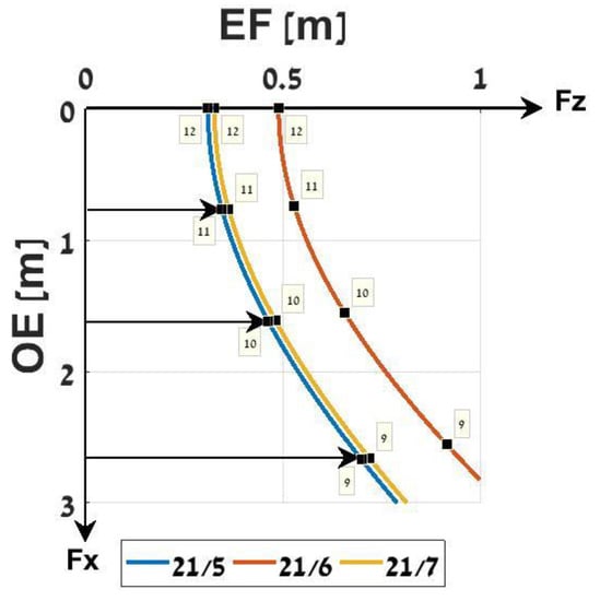 Figure 8 shows the shadow componenet, and , of a pole attached prependicular to a wall at a distance above a horizontal plate, calculated according to Equations (11)–(12) for Tel Aviv (latitude ) for the months May, June and July on the 21st day. The arrows indicate the shadow length at given hours before noon.