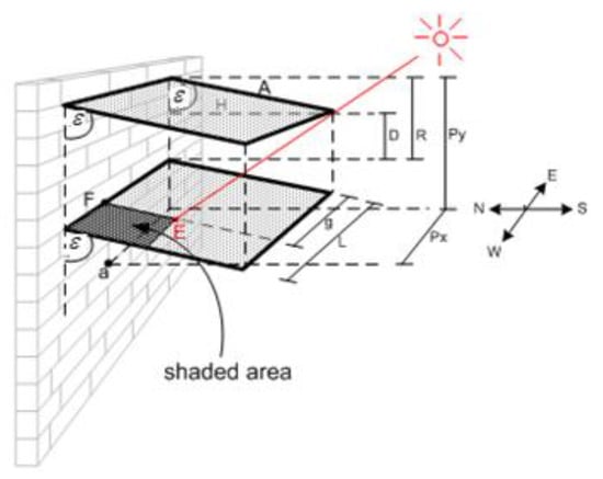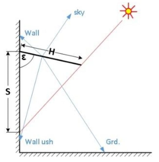 Photovoltaic modules are often integrated into the building envelope and may provide shading, and at the same time perform as an ancillary source of electrical power. Building-integrated photovoltaics (BIPV) are photovoltaic materials used for many years as replacements for conventional building material in some parts of the building such as roofs, canopies, facades, solar carports and others. Overhangs on south-facing walls in northern latitudes are protruding structures and are important in shading windows and doors from undesired solar heat by blocking the sunlight during the summer months. References that illustrate the concept of BIPV are in mentioned in [,,,,,,,,] to name only a few. There are many tools available for shading analysis and designing overhang shading structures (Solar Pathfinder, SunEye, Pilkington, Autodesk ECOTECT, METEONORM, Shadow Analyser, Sombrero, EnergyPlus, ESP-r, and many more). EnergyPlus is a building energy simulation program to model energy consumption and water use in buildings. ESP-r is a program that simulates the energy and environmental performance of buildings. Commercial ray tracing software programs are available and may be used for shading analysis (3Delight, Anim8or, ASAP). Not many publications deal with analytical expressions of the shadow variation on windows, walls and on grounds cast by overhang structures [,,,,,]. The methodology of the present study is different to in the above-mentioned articles including software programs. The study develops basic mathematical expressions, step by step, for calculating the shadow variation cast by overhangs on windows, carports, and for calculating the annual incident energy on overhangs made up of conventional and bifacial PV modules. The calculation of the diffuse radiation involves the calculation of view factors to sky, to ground and between overhangs. The study starts with the shadow on a wall cast by a horizontal pole and follows by shadows on a wall cast by a horizontal plate, inclined pole, inclined plate, shaded areas and overhangs placed one above the other (see Figure 1). The present study provides an insight and methodology for calculating shadows and incident radiation on PV modules deployed on overhangs in BIPV.