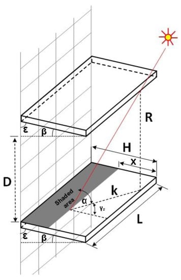 We now analyze the mutual shading by two parallel plates, one above the other, attached to a wall and inclined with an angle downwards. The length and width of the plates are and , respectively, as shown in Figure 10.