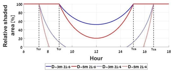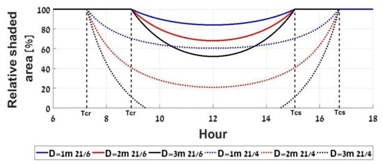 The relative shaded area, in percentage, on a bottom collector cast by an overhang top collector, horizontally installed, is depicted in Figure 12. The collector is of a long edge and a width . The figure shows the daily variation of the relative shaded area on April 21st (dotted lines) and on June 21st (solid lines), for three distances . The starting and leaving times of the solar rays on the bottom collector are denoted by and , respectively. On April 21st, no shading occurs between about 09:30 and 14:30 on the bottom collector for . The shaded area is smaller in winter months.
