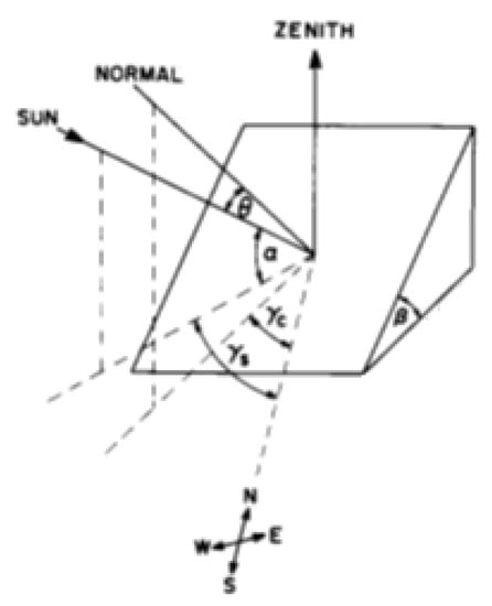 is the sun elevation angle, is the sun azimuth angle with respect to south, is the solar angle ( noon, morning and afternoon) and is the solar time. The solar inclination angle is given by: