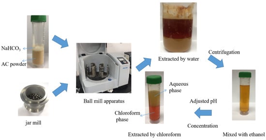 A total of 10.0 g AC powder and 1 g NaHCO3 were added into the PM-200 ball mill with steel balls (3 mm diameter, 150 g). The mixture was ground at 300 rpm for 20 min, then the powder was extracted by water at 50 °C for 30 min and centrifuged at 2650× g for 10 min. The supernatant was mixed with 95% ethanol solution (1:4 v/v) and placed in a refrigerator at 4 °C overnight. Then the mixture was centrifuged at 2650× g for 10 min and the pH was adjusted to <3.0 by 2 M HCl, after which the concentration was extracted by chloroform (1:1 v/v), three times. The chloroform layer was combined and evaporated under reduced pressure using a rotary evaporator. The scheme of MAEM was shown in Figure 1.
