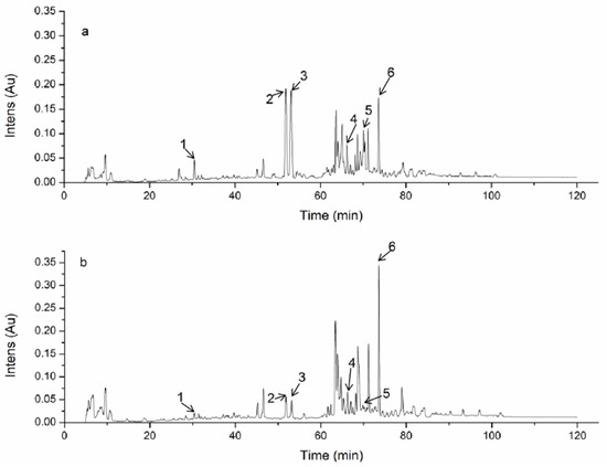 Triterpenoids in Antrodia camphorata have always been a focus of research, and are also the most bioactive components in AC [19]. The contents of some substances in TAEM and TAEE are obviously different (Figure 2). The content of peaks 1, 2, 3 and 5 in TAEM was significantly higher than that in TAEE. We suggest that the components with polarity were much more easily extracted by MAEM.