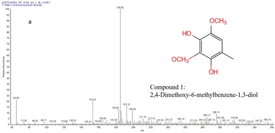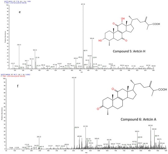MS spectra of compounds extracted from Antrodia camphorata. (a) MS spectra of 2,4-dimethoxy-6-methylbenzene-1,3-diol, [M + H]+ m/z 185, (b) MS spectra of Antcin K [M + H]+ m/z 489, (c) MS spectra of Antcin K [M + H]+ m/z 489, (d) MS spectra of Antcin C [M + H]+ m/z 471, (e) MS spectra of Antcin H [M + H]+ m/z 487, (f) MS spectra of Antcin A [M − H]− m/z 455.