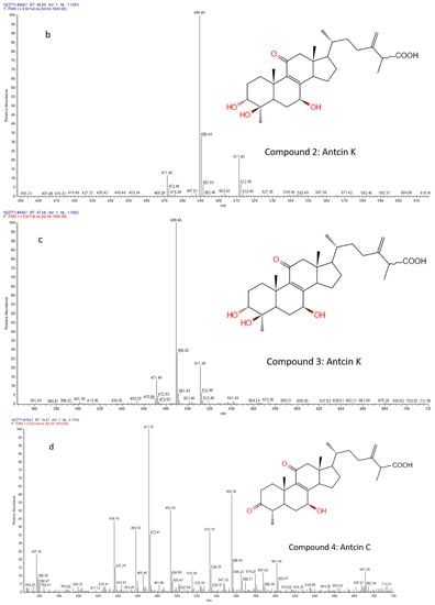 - Huang, H.S.; Hsu, J.L.; Yu, C.C.; Chang, L.C.; Chen, C.R.; Huang, T.C.; Chang, C.I. Qualitative and quantitative analysis of seven signature components in the fruiting body of Antrodia cinnamomea by HPLC—ESI—MS/MS. Acta Chromatogr. 2015, 28, 387–402. [Google Scholar] [CrossRef]