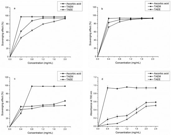 When the concentration reached 1.6 mg/mL and 1.8 mg/mL, the scavenging effects were 94.31 ± 3.01% and 93.17 ± 2.87% while the positive control (ascorbic acid) was 97.53 ± 2.11% at the same concentration. Similarly, scavenging capacity of TAEM and TAEE on ABTS radicals increased rapidly from 0 to 0.4 mg/mL, which was similar to ascorbic acid (Figure 4b). As Figure 4c showed, the scavenging capacity on hydroxyl radicals was stronger than that of ascorbic acid at a pretty low concentration (0~0.4 mg/mL). However, it slowly increased at a concentration of 0.4~2.0 mg/mL, and the scavenging ability was estimated to be 62.62 ± 2.17%. At a concentration of 2.0 mg/mL, the scavenging ability was estimated to be 51.54 ± 1.57%, while ascorbic acid showed a significant scavenging ability of 98.32 ± 1.67% at 0.8 mg/mL. Reducing powers of the samples increased slowly at 0~1.2 mg/mL (Figure 4d), then the values rose in parallel at different levels of concentration until 2.0 mg/mL. The reducing powers hardly increased when the concentration was above 2.0 mg/mL.