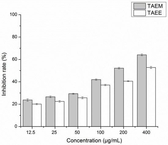 Inhibitory effect on A549 cells of various concentrations of TAEM and TAEE (12.5, 25, 50, 100, 200, 400 mg/mL) was measured. Results showed that both of them inhibited A549 cells in a concentration-dependent manner (Figure 5).