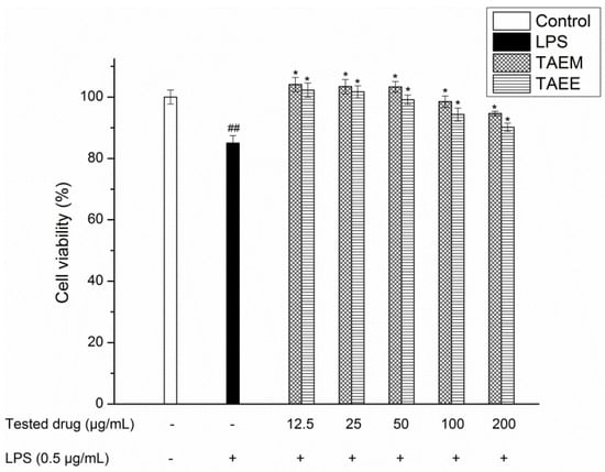 Cytotoxicity of TAEM and TAEE in Lipopolysaccharide-stimulated RAW264.7 cells. Data are expressed as mean ± SD (n = 3). ## p < 0.05 compared with control group. * p < 0.05 compared with LPS treatment group.