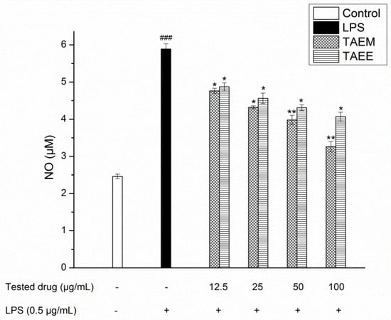NO is a factor synthesized and released by vascular endothelial cells to activate the inflammatory response. The large amount of NO produced by the host in the inflammatory response may provide a defense against the invasion of cells, viruses and parasites, and the non-specific immunity of NO can prevent the invasion of pathogens. To determine the effect of TAEM and TAEE on anti-inflammatory activity, NO production was measured. As shown in Figure 7, a low NO expression (2.46 μM) was exhibited in the control group. After being stimulated by LPS, the NO content was significantly up-regulated to 5.89 μM. In the experimental group, when LPS was present with the co-treatment of different concentrations of tested drugs, the production of NO stimulated by LPS was significantly decreased. More specifically, production of NO was decreased to 4.76, 4.32, 3.98 and 3.26 μM by TAEM, and 4.87, 4.56, 4.31 and 4.07 μM by TAEE at 12.5, 25, 50, 100, 200 μg/mL, respectively. Obviously, TAEM possessed stronger inhibition ability on NO production than TAEE.