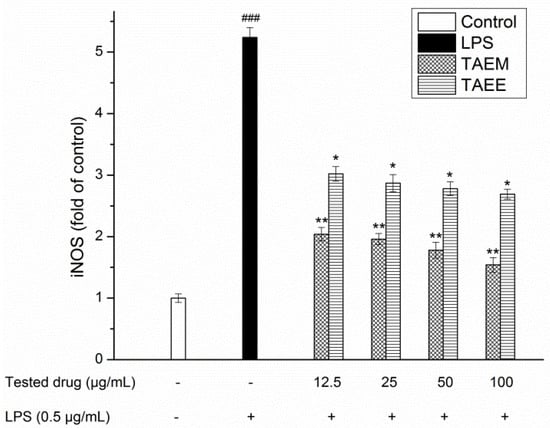 Inducible nitric oxide synthase (iNOS) is an indispensable enzyme for NO synthesis [29]. In activated macrophages, regulation of iNOS levels is critical for NO production. Regulation of NO production or iNOS expression may be an important target for the treatment of inflammation. As shown in Figure 8, the control group was treated without tested drugs or LPS. The basal expression of iNOS protein in RAW264.7 cells was very low. In the LPS group, the expression of iNOS protein in RAW264.7 cells increased significantly after stimulation by LPS, which was 5.24 ± 0.16-fold of the control. When TAEM and TAEE (12.5 μg/mL) were given, the expression of iNOS protein decreased significantly to 2.04 ± 0.11 and 3.02 ± 0.12-fold of the control, TAEM and TAEE both inhibited iNOS expression in a concentration-dependent manner. However, TAEM exhibited a stronger inhibition activity than TAEE especially at a high concentration (50~100 μg/mL).