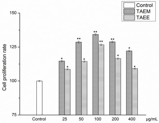 Effects of different concentrations TAEM and TAEE on the growth rate of splenic lymphocyte in rats. * p < 0.05, ** p < 0.01 compared with control group.