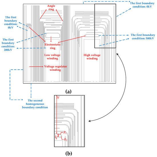 where ε is the dielectric constant; ϕ is the electric scalar potential of the electrostatic field; Ω is the whole computational domain; Г1 is the high voltage winding boundary; Г2 is the low voltage winding boundary; Г3 is the regulating winding, the upper, and the right boundary; and Г4,5 are the left and lower boundary, respectively.