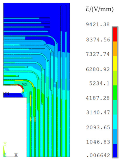 The computer processor we used had an Intel(R) Core(TM) i5-7500 with 8.00 GB of memory. After modeling, meshing, applying boundary conditions, and solving by APDL, the electric field intensity nephogram of the initial structure is shown in Figure 2. By analyzing the initial insulation structure of the power transformer, it can be found that the maximum electric field intensity appeared at the upper right corner of the electrostatic ring. Therefore, we try to reduce the maximum electric field intensity by changing the structure parameters related to the electrostatic ring.
