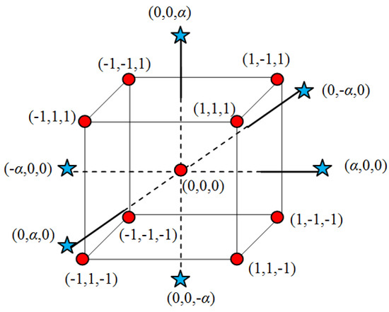 Figure 3 shows the distribution of sample points, taking three variables as an example [29]. Where α = 2n/4; (0,0,0) is the center point; (±1,±1,±1) is the cubic point; and (±α,0,0), (0,±α,0), and (0,0,±α) are the axial points.