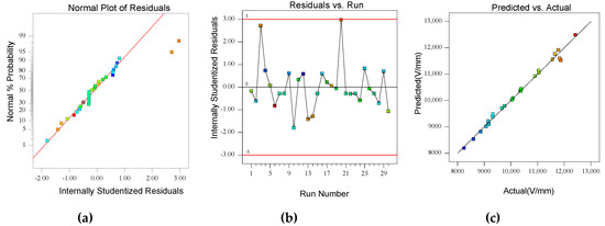 As can be seen from the residuals versus run plot in Figure 6b, the residuals of runs were distributed within the prescribed appropriate range, which implies that choosing the quadratic polynomial as the response surface function is particularly suitable. In Figure 6c and Table 9, there was a good correlation between the predicted value and the actual value, which indicates that the polynomial model has a good predictive ability. In a word, the response surface model adopted in this study is acceptable.