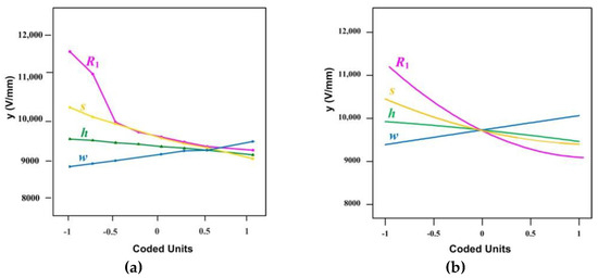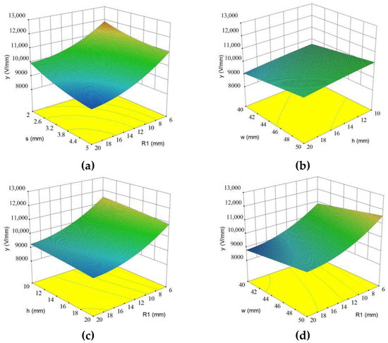 As can be seen from Figure 7c,d, compared with s and w, the change of the maximum electric field intensity was larger with the change of R1. The maximum electric field intensity increases with the increase of w, which has negative effects on the model. Therefore, in the structural design process, a smaller starting position w should be selected as far as possible within a reasonable range. From the variation range of the two figures, the interactions between R1 and h, R1, and w may be a significant factor affecting the maximum electric field intensity. However, since their p-values in Table 8 are little larger than 0.05, R1h and R1w can be considered insignificant factors.