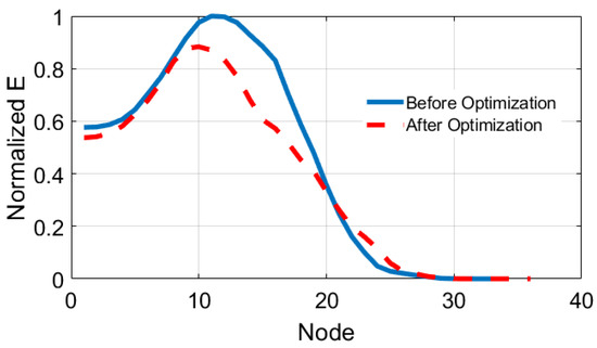 It is an important goal of the response surface optimization to get the optimal results with the appropriate values assigned to each variable. Equation (8) is the quadratic response surface model with single objective optimization, which can be solved quickly by quadratic programming. By comparing the maximum electric field intensities on the electrostatic ring before and after optimization in Figure 8, the decrease of the maximum electric field intensity can be observed more intuitively. The result shows that the maximum electric field intensity has been significantly reduced.
