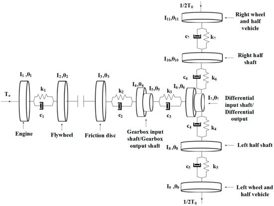 The dynamic representation of the drivetrain system is achieved through a multi-degree of freedom system model. The torsional model comprises 9 degrees of freedom (9-DOF) including a dry friction clutch disc as shown schematically in Figure 1. Each inertial element represents a component of the powertrain system. The engine is represented by the inertial element, . The second inertial element, , represents the flywheel and the third inertial element, , represents the friction disc. In addition, the fourth and fifth inertial elements, and , are those of the gearbox and the sixth and seventh, and , are for the differential unit. Inertial elements and are designated to the left and right rear axle half-shafts in this rear wheel drive system and and inertial elements are those of the left road wheel and half vehicle, the right road wheel and half vehicle respectively.