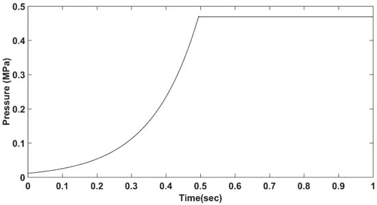 The Equations of motion (1)–(9) for the case of slipping at the clutch interface during clutch engagement and Equations (13)–(20) for the fully clamped clutch state are solved numerically as a system of dynamic equations of motion, together with the thermal differential equations of the clutch, based on Equation (32). The dynamics and thermal equations are coupled together into a single thermal-dynamics model by transient angular velocities, which are an output of the dynamics model and serves as an input to the thermal analysis. The 4th-order Runga-Kutta step-by-step integration algorithm is used for the solution of equations of motion. The initial engine speed at the instant of clutch actuation is chosen as 100 rad/s or an equivalent engine speed of 960 r/min, which is the idle engine speed for the vehicle under investigation. The duration of clutch engagement is set at 0.5 s, as can be seen in Figure 2 in line with the range reported by Centea et al. [,]. Additionally, the initial temperature for all clutch elements under consideration was set to 20 °C (the average ambient Spring/Summer temperature in the UK). Additionally, the temperature of the engine and the surrounding compartments is considered to be constant at 20 °C (start-up conditions) for the short duration of the simulation. All the parameters used in the model are listed in Table A2, Table A3 and Table A4 in Appendix A.
