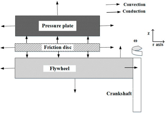Applying Equation (32) for each of the main components of the clutch system (friction disc, flywheel and the pressure plate) and taking into account the heat fluxes as portrayed in Figure 3, three differential equations are obtained for the friction disc, flywheel and the pressure plate as: