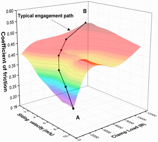 The coefficient of friction used in the current analysis is obtained through pin-on-disc tribometry. The frictional characterization of the clutch lining material is performed under realistic vehicle clutch engagement conditions. It was, therefore, ascertained that the pressures developed in the contact between the pin and the disc are similar to those in a real vehicle clutch contact. In addition, the rotational speed of the disc was adjusted so that the relative sliding speed between the pin and the disc was representative of that occurring between the actual clutch components in a real vehicle during take-off. Furthermore, the disc was equipped with a heating element that allowed for heating of the contact between the pin and disc to the bulk temperatures that exist in a real clutch contact in a vehicle []. The friction lining materials used for the tests were cut from a real vehicle clutch lining material. Table A1 in Appendix A provides information about the load and speed conditions in the real vehicle clutch contact and those simulated by the pin-on-disc tests. Each measurement included new samples and the tests for each sample were repeated six times [,]. Following the completion of friction measurements, a carpet plot is produced, for frictional characteristics of the clutch lining (a sample of which was attached to the pin of the pin-on-disc tribometer) in contact with the surfaces of either the pressure plate or the flywheel, used as the disc under various operational conditions such as slip speed and clamp load (Figure 4). Figure 4 also shows a typical engagement path, depicted by the black line. The letters A and B represent the beginning and the end of the engagement process. This is a typical friction lining characteristic which varies according to the lining composition as well as its wear state (i.e., age). It is noteworthy that variation of coefficient of friction with slip speed mostly exhibits a negative slope. Therefore, depending on the negativity of this slope (according to lining type and wear state) and other operating conditions such as loss of clamp load and operating temperature, the propensity to judder alters.