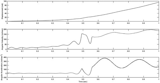 Predicted variations of displacement, angular velocity, and angular acceleration for the worn friction lining material during clutch engagement.