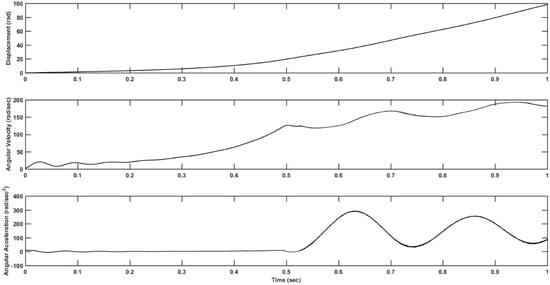 Figure 5 and Figure 6 show the variations in displacement, angular velocity and angular acceleration of the clutch friction disc during a single clutch engagement for the new and worn clutch friction linings. The main differences in the characteristic responses for the new and worn lining materials are in the variations of angular velocity during clutch engagement. Close to full engagement, stick-slip oscillations occur in the form of sudden angular velocity fluctuations (Figure 5). Additionally, the stick-slip oscillations can also be noted in the abrupt angular acceleration reversals. Larger negative μ-v characteristic in Table 1 for the new lining material provides good explanations for the observed judder vibrations in Figure 5 for the new lining material. This is in line with the other findings such as Centea et al. [,] and Gkinis et al. [].