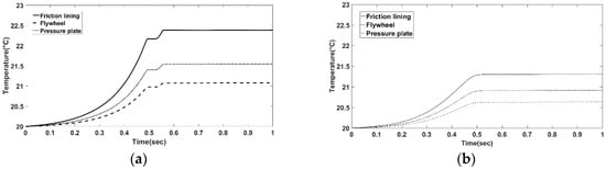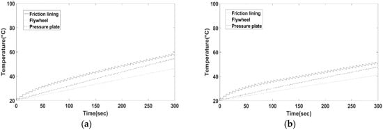 The effect of consecutive and prolonged clutch engagements is shown in Figure 8. Figure 8a,b present the temperature variation in the main clutch components with time for the new and used friction lining material respectively, for the first maneuver.