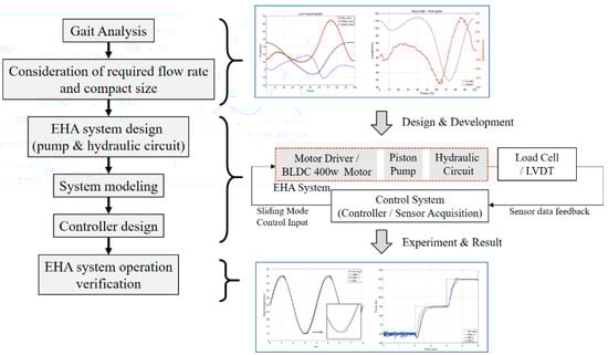 So, the flow of the paper is shown in Figure 1 and its composition is as follows. The developed axial piston pump is presented in Section 2, and the hydraulic circuit is presented in Section 3. Additionally, we modeled the system mathematically, and this is presented in Section 4. Finally, we designed a controller and verified the performance of the proposed EHA system via experiments, which is presented in Section 5.