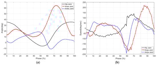 The angle and angular velocity of each joint in the sagittal plane according to the gait cycle: (a) is the angle, and (b) is the angular velocity.
