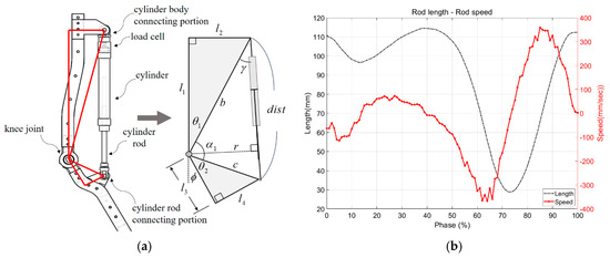 (a) This is the knee structure of the exoskeleton robot and its simplification. (b) This is the change in length of the cylinder and the speed.