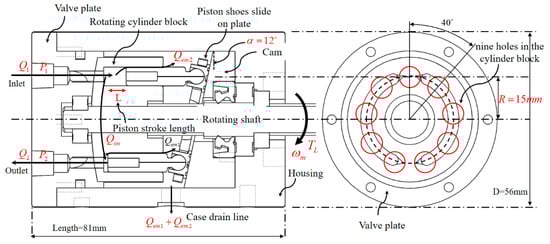 The velocity of the piston becomes in Equation (3). is the angular velocity of the cylinder block. At this time, the instantaneous discharge amount of the pump is expressed as follows [23]: