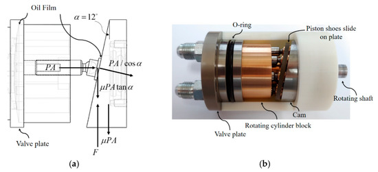 The suction and discharge of the hydraulic pump change according to the rotation direction of the motor. First, when the motor rotates the drive shaft of the pump, the cylinder block connected to the drive shaft rotates. At this time, the piston shoe connected to the piston and ball socket joint moves along the surface of the cam, and the piston moves up and down in the cylinder block. As a result, the hydraulic pressure is produced, and then the pump starts sucking and discharging the hydraulic fluids. Because the valve plate and the cylinder block rotate in surface contact, they are made of different materials in consideration of friction. The cylinder block is made of brass and the valve plate is made of iron. Furthermore, when the piston pushes the hydraulic fluids, the oil film is formed between the cylinder block and the valve plate, so that the cylinder block gently rotates. For the same reason, the piston was made of brass, and the hole was made in the piston and shoe to produce an oil film. The valve plate and the cylinder block contact each other, and the pistons with shoes and the cam are shown in Figure 6b (the inside of the proposed pump).