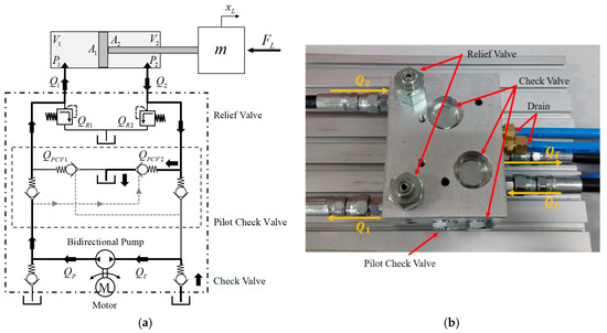 Figure 7a shows the designed hydraulic circuit. The circuit consists of the bidirectional pump, two pilot-operated check valves, four check valves, two relief valves, and the oil tank. and are the actual flow rates flowing in and out of the cylinder. and are drained through the relief valve. For system safety, the relief valve is set so that the internal pressure does not exceed 25 bar. When a motor rotates, the pump produces pressure and the cylinder moves forward. and are sucked through the pump from the tank, and unlike the double-rod cylinder, the cross-sectional areas and in the single-rod cylinder are different. So, the flow rates and are different. The pilot-operated check valve compensates for this difference in flow, allowing the cylinder to move gently [26]. The pressure operates the pilot-operated check valve on the line, which results in being equal to and flowing into the tank. There are also check valves between the cylinder and the pump, so that the flow from the cylinder does not directly enter the pump. By designing the hydraulic circuit in this way, the hydraulic fluids circulate in the system but can be viewed as an open circuit. So, the mathematical modeling is simplified. Also, if the motor is not driven, the pilot-operated check valve is not opened, and the cylinder can maintain a constant force because of the check valve. Figure 7b shows the actual hydraulic circuit; the circuit was modularized with a compact size of . Because of this, the hydraulic hose between the valves was eliminated. So, the circuit has been simplified, and maintenance of leaks has become easier. The oil tank was made of acrylic, and its size is . The cylinder’s maximum pressure was 3.5 MPa, the inner diameter was 20 mm, and the stroke length was 120 mm.