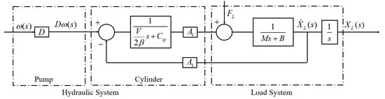 when the cylinder moves forward, the pilot-operated check valve on the opposite side is opened by the pressure . Because the flow rate is drained into the tank, we do not need to consider pressure . Assuming that there is no disturbance, Equation (17) is rearranged by the Laplace transform and Equation (18) is obtained as: