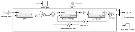 The reference input for tracking of the position was a sine wave, and the PID control and sliding mode control were compared through experiments. First, we simulated them with Matlab Simulink, as shown in Figure 10, and the results are shown in Figure 11. Table 3 shows the parameters of the cylinder and pump, and Table 4 shows the PID control and sliding mode control parameter values for each experiment.