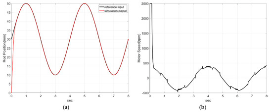 As shown in Figure 11a, we can see that the cylinder followed the sine wave well. Figure 11b shows the speed of the motor. Because the initial position of the cylinder was 0 mm, the initial rpm of the motor was too large to follow the reference input. After the current state reached the sliding surface, we can see that control value switched in succession for continuous tracking.