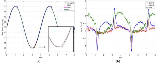 On the other hand, when the moving speed of the cylinder was high, this problem did not occur in the sliding mode control and PID control. However, PID had a larger error than sliding mode control when tracking the position (Figure 12b). The PID controls showed good follow-up, but it is unstable and slower than the designed SMC 1. In case of PID control, the error value has some positive offset in 0–1 s, 3–5 s, and 7–8 s intervals. This is because the applied cylinder is a single rod, not a double rod. In other words, because the volumes of both chambers are different, when the same amount of flow rate flows into the cylinder, a speed difference of the forward and backward movement of the rod occurs. In order to follow the sine wave, the motor must rotate at high speed in a section of 0–1, 3–5, 7–8 s. At this time, the limit of the PID controller was shown in this section. In terms of the performance of the controllers, SMC 1 was more accurate than SMC 2 in terms of following the desired input into the sliding surface. When the state variables enter the sliding surface, the control input is switched to the magnitude of . If the larger disturbance enters the system, it is temporarily outside of the surface boundary. Theoretically, a larger value can be given to prevent this, but when applied to the actual system, a large vibration is generated. In the experiment, the average error of SMC 1 was 0.16 mm, which is a satisfactory value for a practical system.
