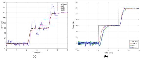 Figure 13 shows the results of the cylinder tracking the desired force through the sliding mode control and the PID control. The cylinder followed forces of 60, 90, and 120 N at 2 s intervals. As shown in Figure 13a, SMC 1 was set to and , SMC 2 was set to and , and SMC 3 was set to and . Overshoot occurred in the system at , and the system became unstable. Also, chattering occurred when even with the same value. Therefore, the cylinder was most stable when and (SMC 2). Figure 13b shows a comparison between SMC 2 and the PID1,2 control. The PID control showed good follow-up but was unstable and less accurate than the designed SMC 2.