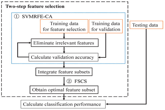 The two-step feature selection method. In which SVMRFE-CA denotes support vector machine recursive feature elimination-classification accuracy, FSCS denotes F-score and the correlation score.