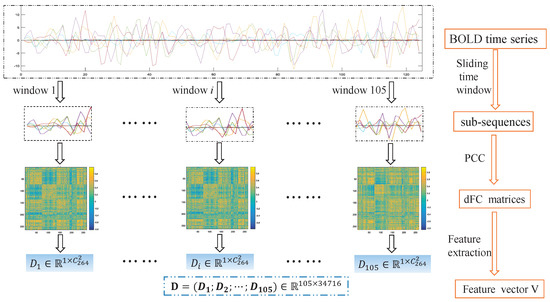 Thus, considering the symmetry of PCC for two ROIs, for each subject, the dFC feature matrix is with being the number of sliding windows, where 34,716. For each subject, the average connectivity information is further extracted from matrix D by calculating the mean of each column. The obtained feature vector for each subject is a description of the average dynamic functional connectivity between each of two ROIs. The calculation approach of the feature vector for each subject is shown in Figure 3.